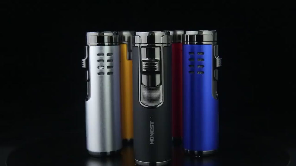 Cylindrical windproof 4 nozzles design quad jet flame butane gas cigar cigarette Lighter.Gift box packaging.Adjustable flames control.Refillable butane gas fuel.Come with cigar punch.Compact and unique design,light weight easy to use and carry.Perfect as a gift for friends and family.The lighter comes delivered in an easy-to-store box and is available in a selection of different colors. Please select the color of choice from the available options in the dropdown menu when placing your order.
